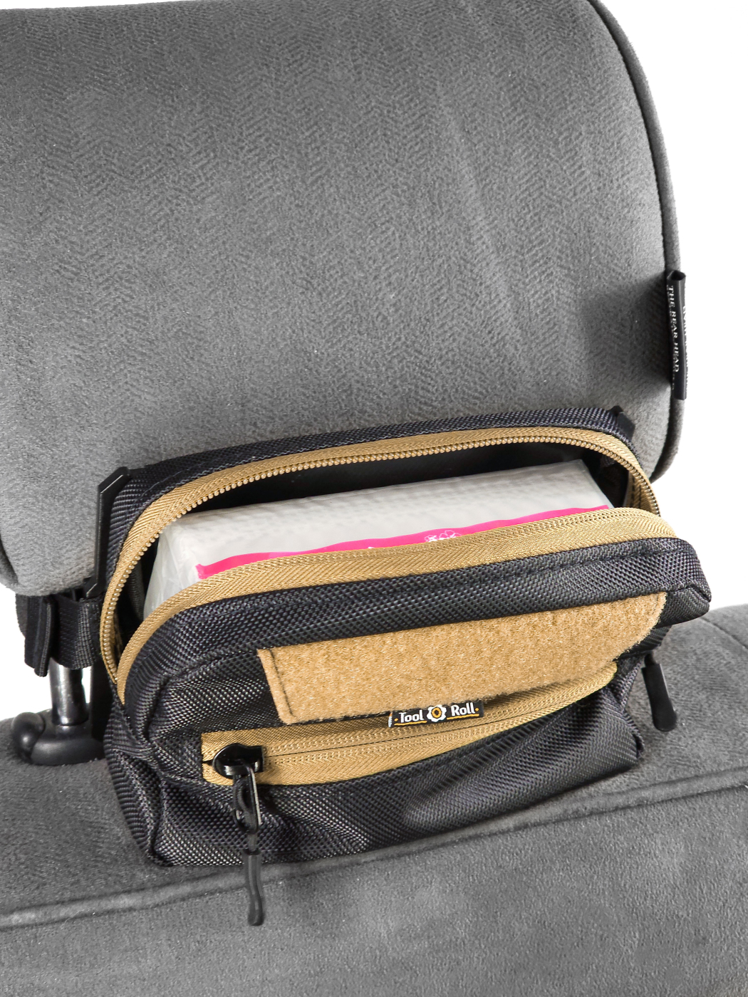 Пластиковая платформа 4 мм держит форму. Размер 18х13х6 см — влезет всё: от салфеток до power bank. Крепление на фастексах — просто щелк и готово. Сидит на подголовнике мертво, не болтается.