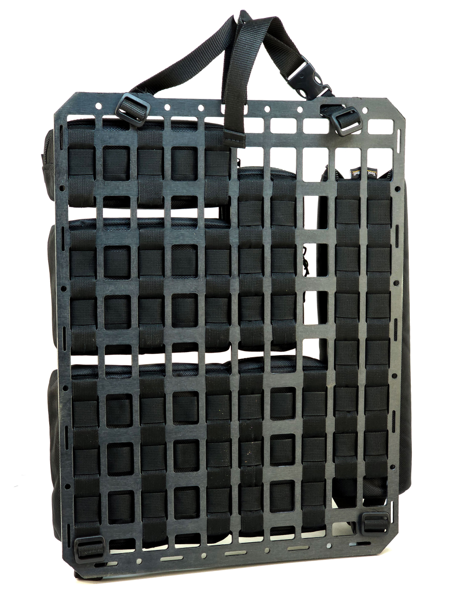 Основой органайзера является панель из пластика, толщиной 2 мм, обшитая тканью с ячейками MOLLE/PALS для крепления подсумков, таким образом мы достигли потрясающей прочности и достаточной жесткости основы.