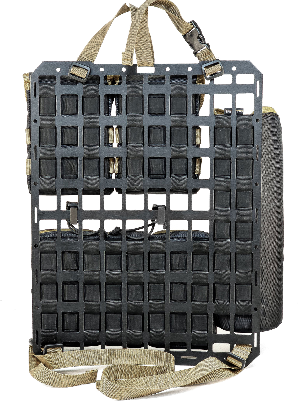 Основой органайзера является панель из пластика, толщиной 2 мм, обшитая тканью с ячейками MOLLE/PALS для крепления подсумков, таким образом мы достигли потрясающей прочности и достаточной жесткости основы.