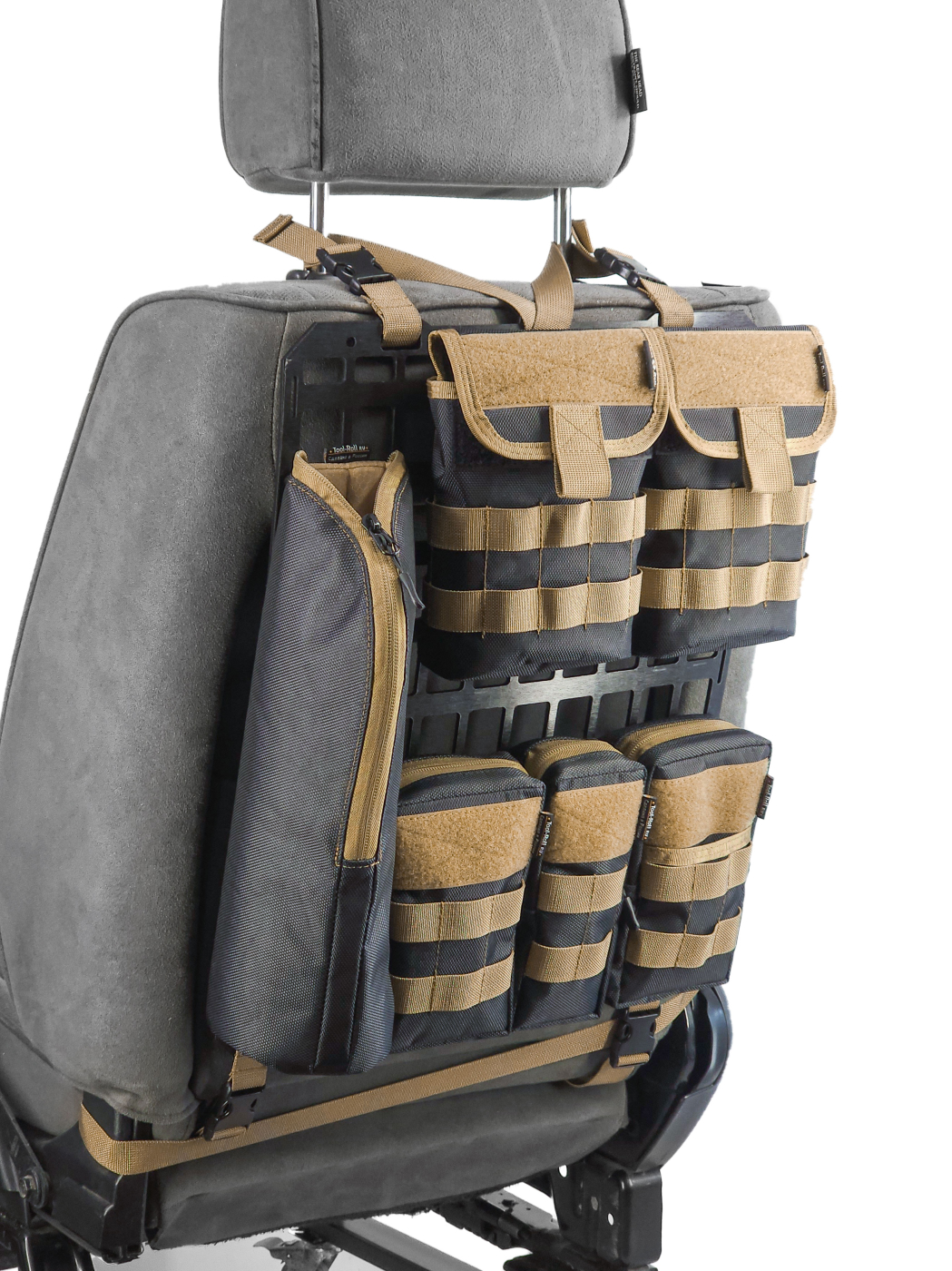 Органайзер на спинку сидения из 6 подсумков и одной жесткой панели MOLLE из пластика HDPE толщиной 4мм.