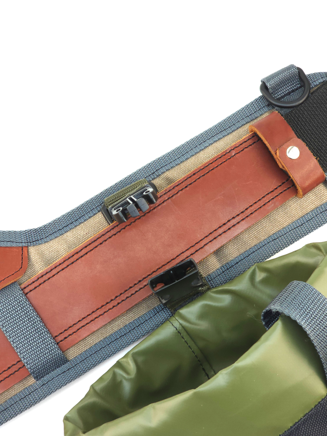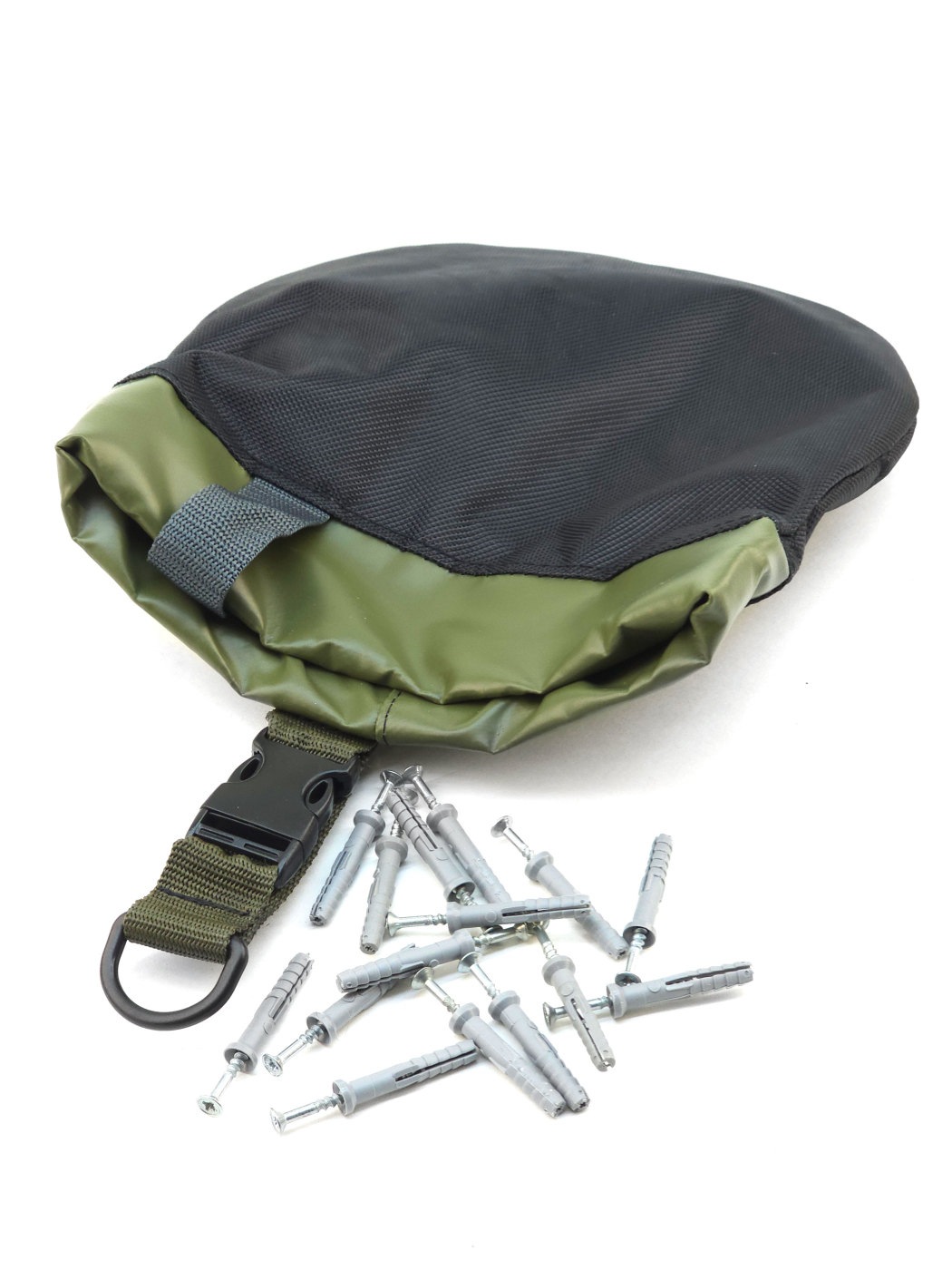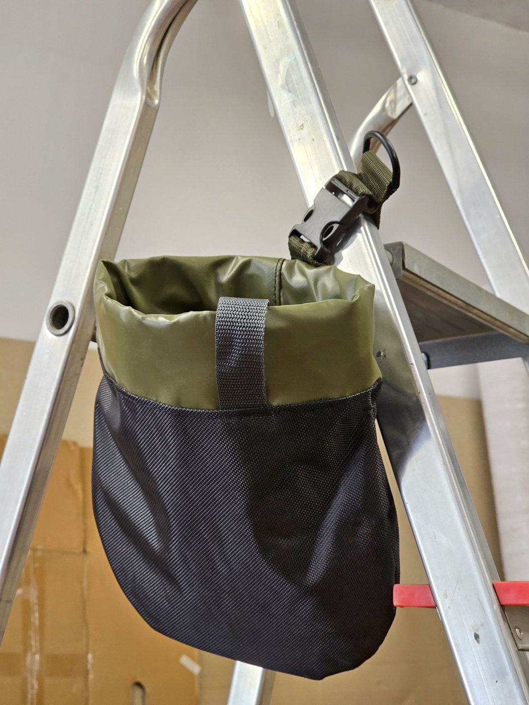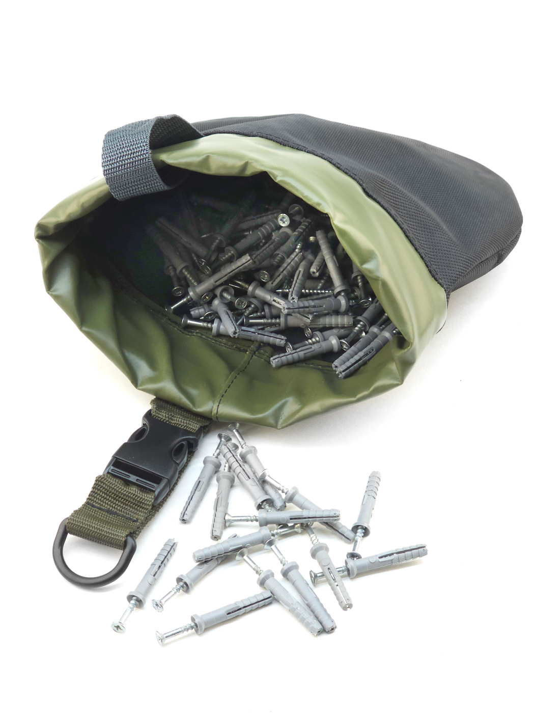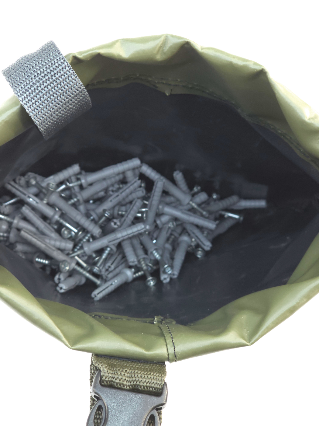 Специальная самозакрывающаяся горловина предотвратит выпадение крепежа или инструмента в самый ответственный момент, когда руки заняты и нужно переместиться в неудобной позе. Сумка закрывается одним движением, достаточно нажать на горловину спереди и крепеж надежно защищен внутри, прочная боковина не даст ему выпасть даже если перевернуть сумку вверх ногами.
